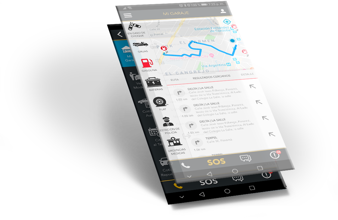 Un menú donde encontrarás a un toque, lugares de interés en el camino, como servicio de gruas, estaciones de gasolina, centros de baterías, talleres de llantas, estaciones de policía y hospitales. Basándose en un radio de 5km al rededor de tu ubicación, dándote además de las ubicaciones más cercanas, acceso a rutas GPS y números de teléfono.